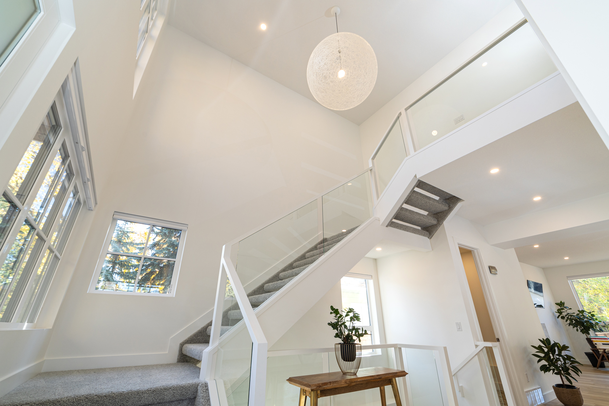 Based on our Element floorplan, our clients modified the space allocated for the garage to include a main floor office, a spacious mud room with an apron sink and extensive shelving storage. Preserving the views to the back of the home, a side entrance to the mudroom was created accessible by both the front and back yard,